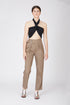 Wide-cut, high-waisted pants; belt detail at the waist. Italian pockets. Contrasting stitching. Khaki color.