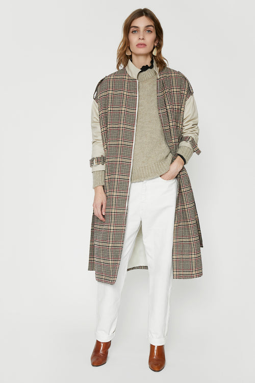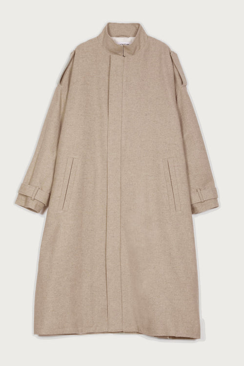 Oversized long coat in Italian cotton cloth. Shoulder tabs. Center front zip fastening. Piped pockets. Cuff tab with buckle. Belt attached to the fabric. Fully lined.