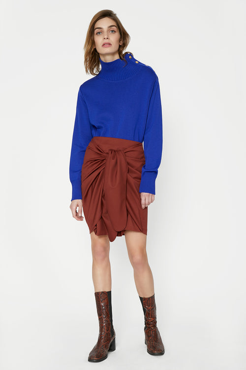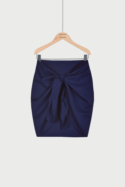 Short skirt in super 100s wool. Bow at the waist. Invisible zipper on the side. Baltik Blue color.