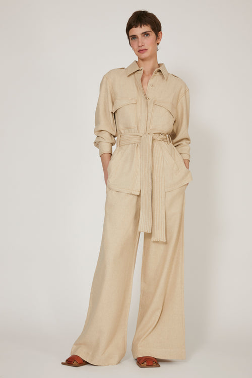 Jacket inspired by the safari jacket in silk bourrette. Shoulder tabs. Patch pockets with flaps. Hidden button placket in the middle of the front closed by covered buttons. Contrasting stitching. Removable belt in the fabric. Natural Ecru color.