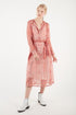 Long dress in printed Italian silk voile. Round neck with hidden button placket in the middle of the front. Shoulder cutouts and pleats. Removable belt. Exclusive Carmina print.