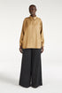 Oversized long-sleeved shirt in Tencel™ woven in Italy. Goldwood-coloured velvet piping detail at the collar. Centre front button placket closed with horn buttons. Slightly rounded slits at the bottom of the garment. Sand colour.
