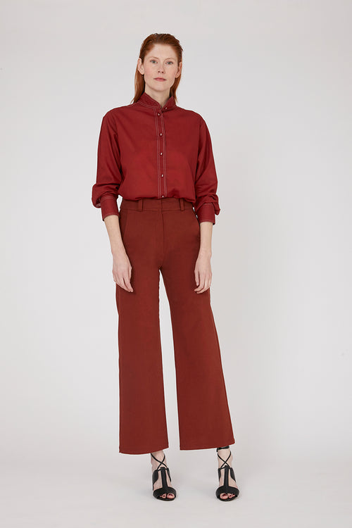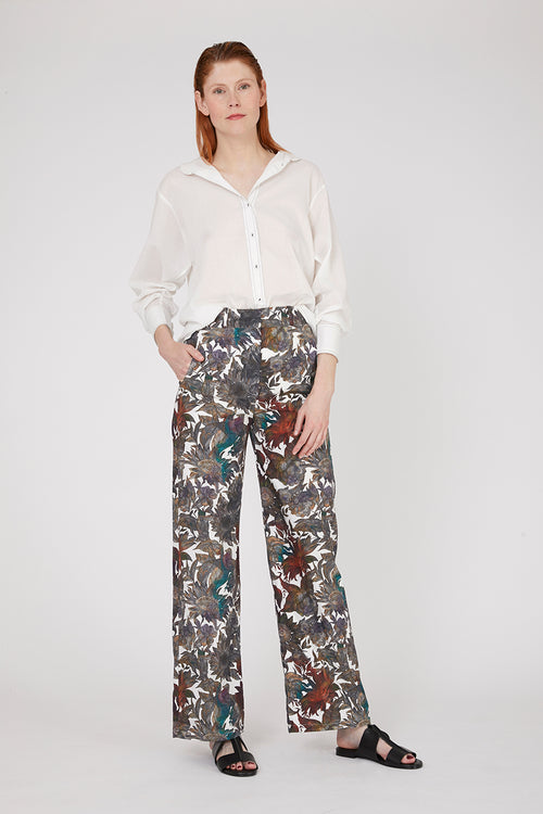 Slightly flared pants in printed organic cotton poplin. Italian pockets on the front and piped pockets on the back. Zipped opening with two hooks and a real mother-of-pearl button; made in France. Exclusive Sunflowers print developed in the Valentine Gauthier workshops.