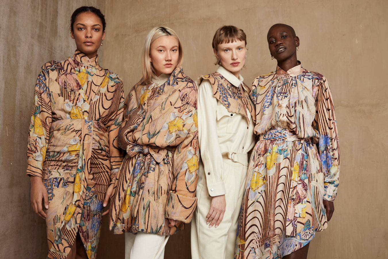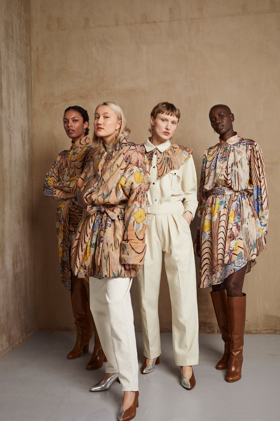 Les soies sergées et bourrettes sont imprimées du dessin Brutalism. Il est pensé comme un paradoxe entre la douceur d’un herbier art déco aux tons pastels, référence à la description d’une nature sexuée de David Herbert Lawrence et le trait aléatoire, instinctif du courant brutaliste. L’imprimé est à la fois doux et fort et marque l’empreinte de cette collection par des jeux de volumes et d’asymétries subtiles sur des blouses, des robes et un manteau doudoune ample, réinterprétation du Deel mongol.
