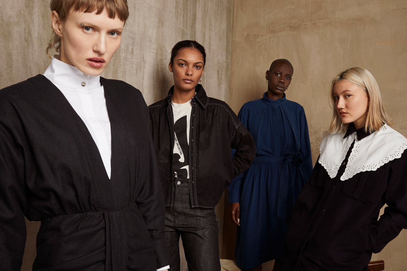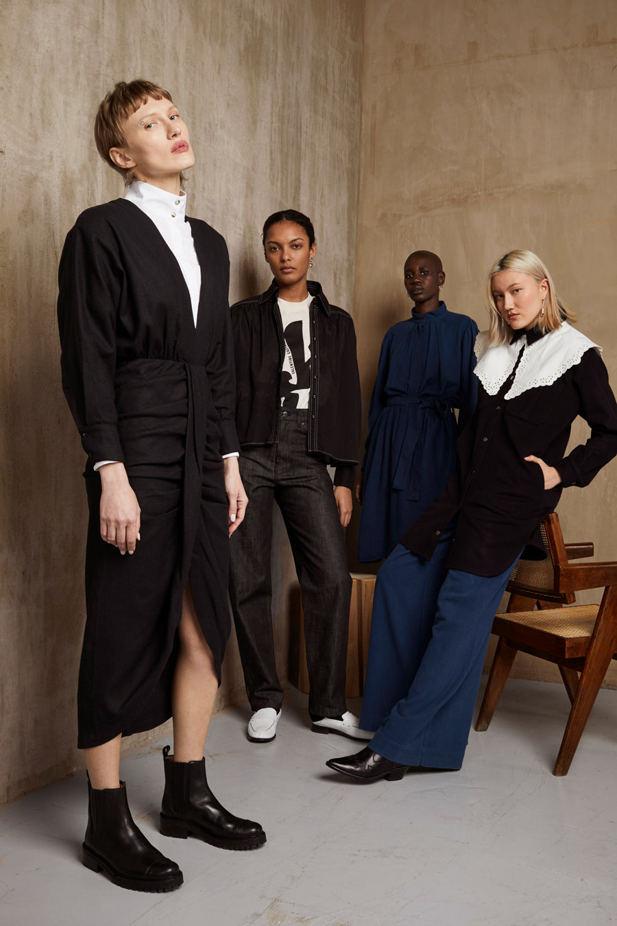 Un jeux de noir et de bleu midnight façon denim sur une toile de soie rustique surpiquée, entre raffinement de la matière et esprit workwear, se féminise avec des jupes froncées et sculpturales taille haute.