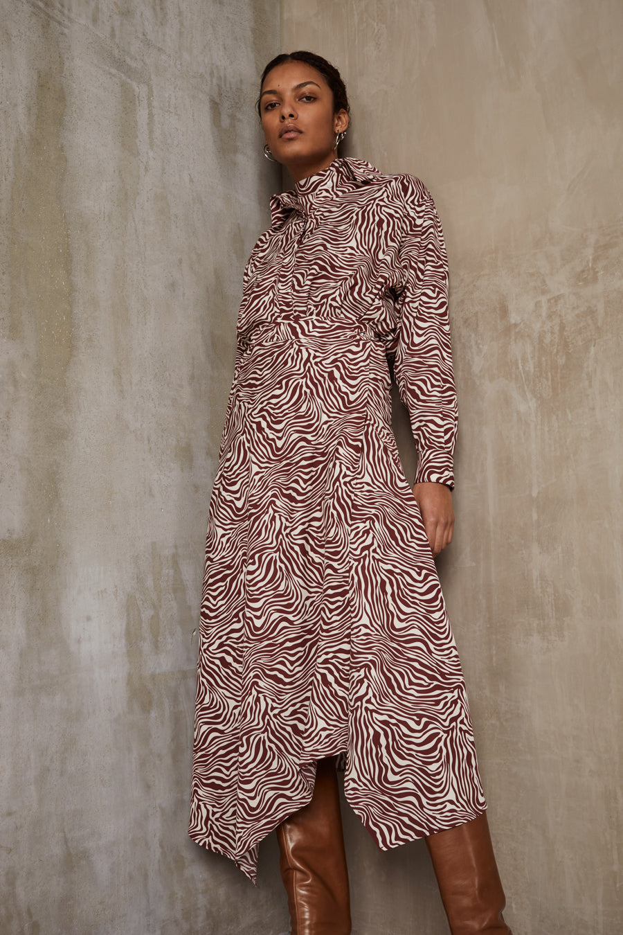 Le super 100 au coloris Barn Red en pantalons à pinces taille haute, blazer Boyish aux détails féminins, ou robe-tunique longue répondent à l’artéfact de l’imprimé Rosa sur du Tencel lourd aux formes féminines asymétriques et ajustées.