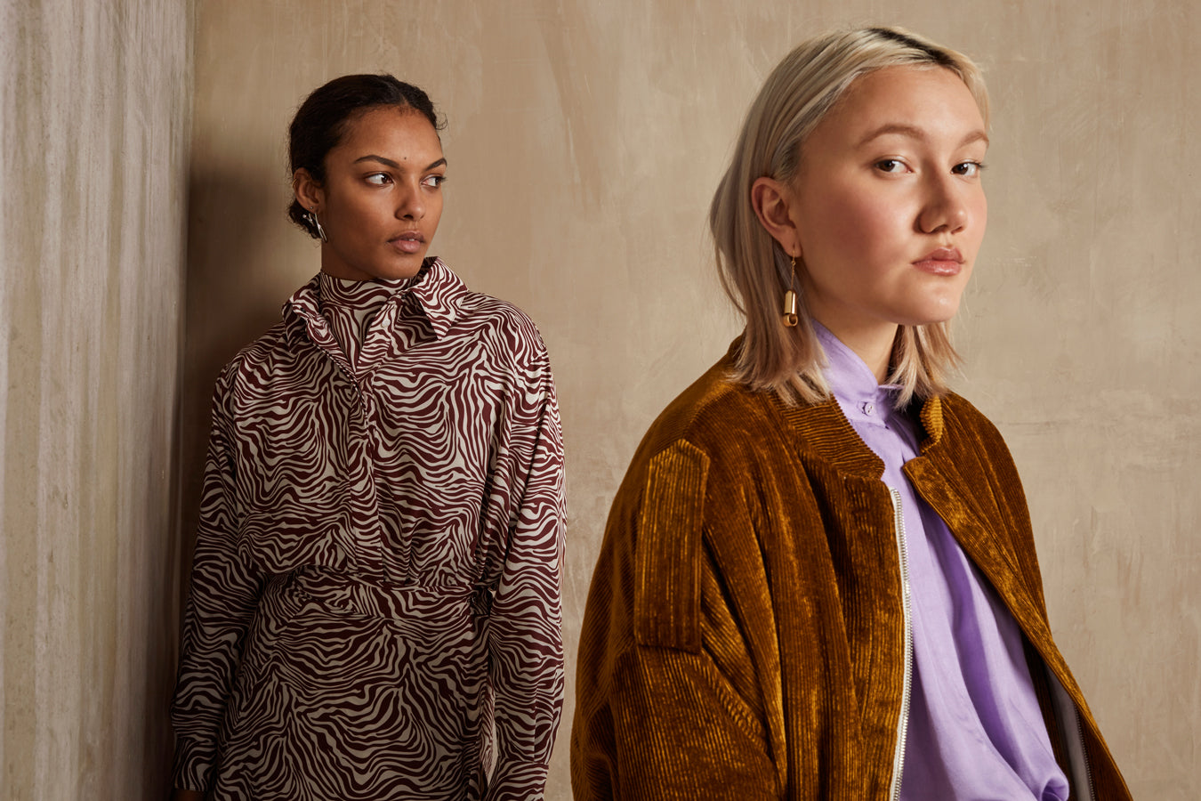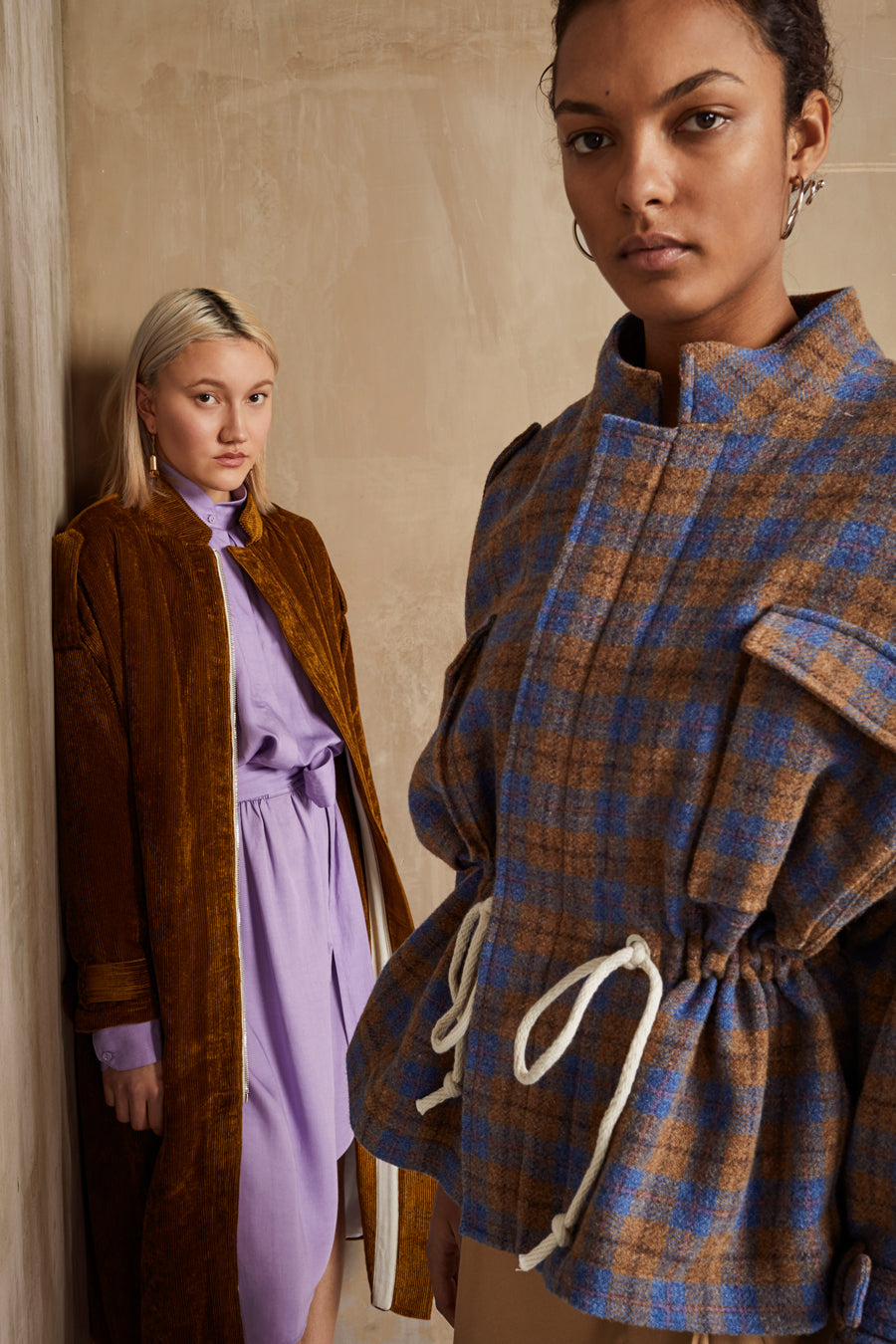 Des velours souples à reflets aux coloris Berry et Goldwood, des tencels et des mailles oversize en alpaga super fine de couleur Thistle rafraichissant, rehaussent les matières rustiques aux tonalités minérales.